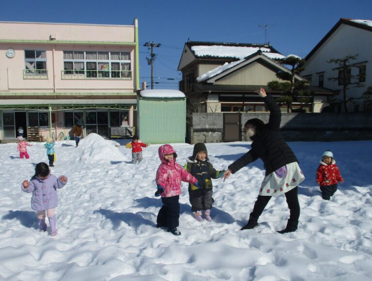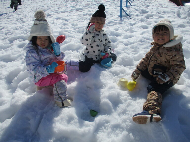今日はいいお天気!気温も高く絶好の雪遊び日和ということで、どの年齢も園庭で雪遊びをしました。まずはひよこ・うさぎぐみさんからお外へGO!の前に雪遊び準備です。「手袋でき~ん」「長靴入ら~ん」「先生!手伝ってぇ~」の声があちこちから飛び交いながらも何とか準備が完了し、今度こそお外へGO!
