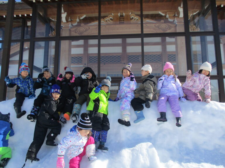 本堂の屋根雪がすべて下に落ち、それが格好の滑り台状になっているので、子ども達はよじ登っては尻滑りをしたり砂遊びのバケツやシャベル・カップを使ってかき氷づくりなどをしたりしました。