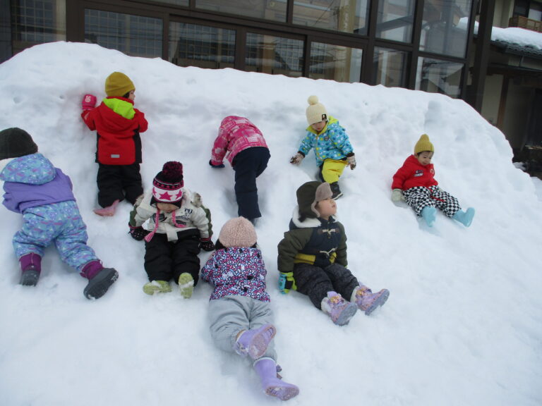 今日も高みを目指して(!?)雪山チャレンジ。山によじ登っては尻滑りをしました。砂遊び用の道具を使っておままごとをしたり、雪の凹凸を馬(バイク!?)に見立てて2人乗りをしたりしましたよ。雪遊びの準備や片付けも日に日にスムーズになってきました(ちょっとずつ)