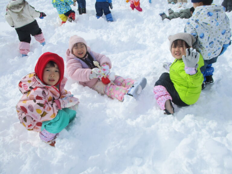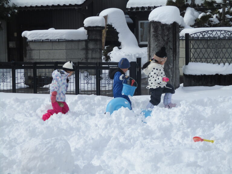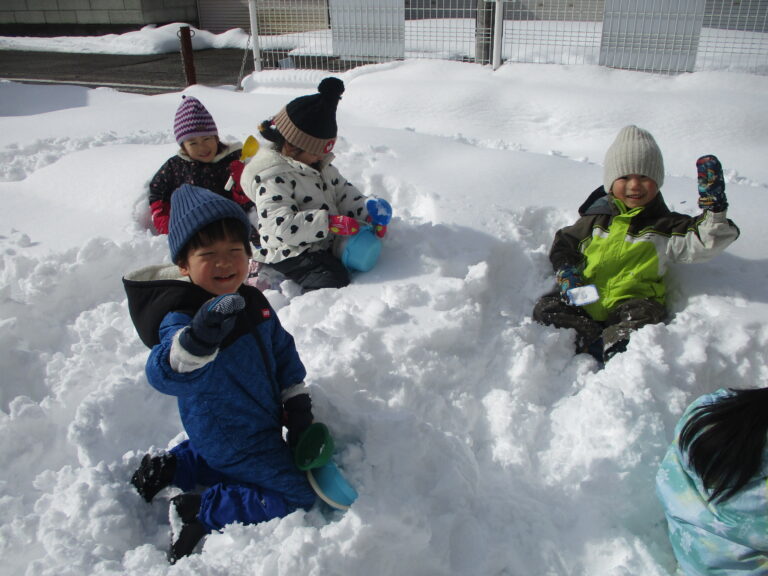 昨日の大雪&真冬日の影響(おかげ!?)で雪質最高!氷できてる~!!と、子ども達にとっては楽しい×2の雪遊びとなりました。フカフカの新雪はやっぱりダイブしたくなるよね。氷を発見したらワクワクするよね。園庭のあちこちで思い思いの雪遊びが展開されましたよ。