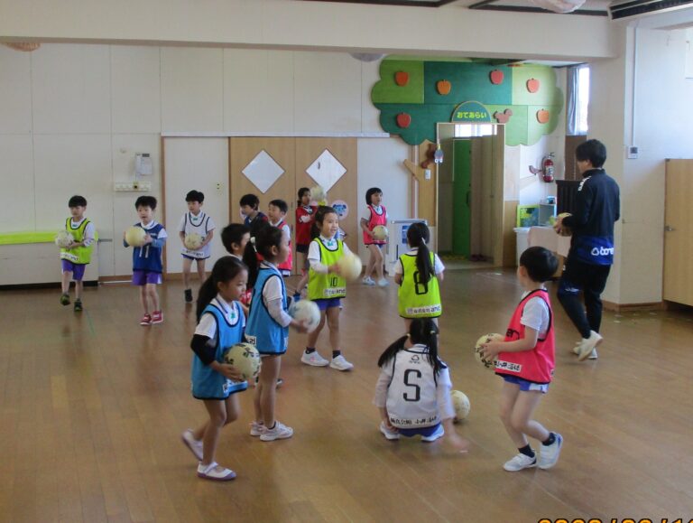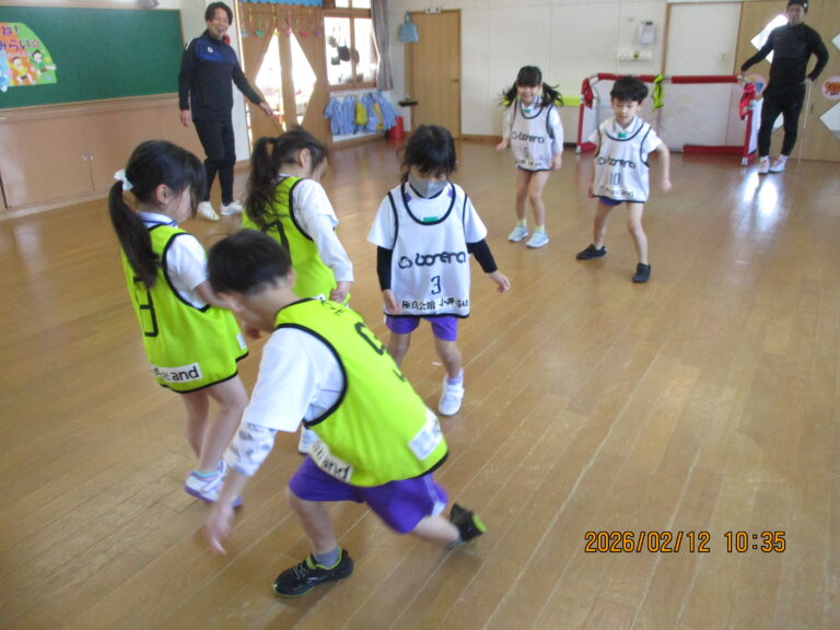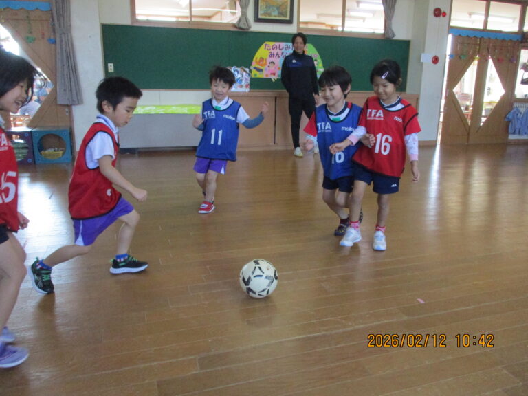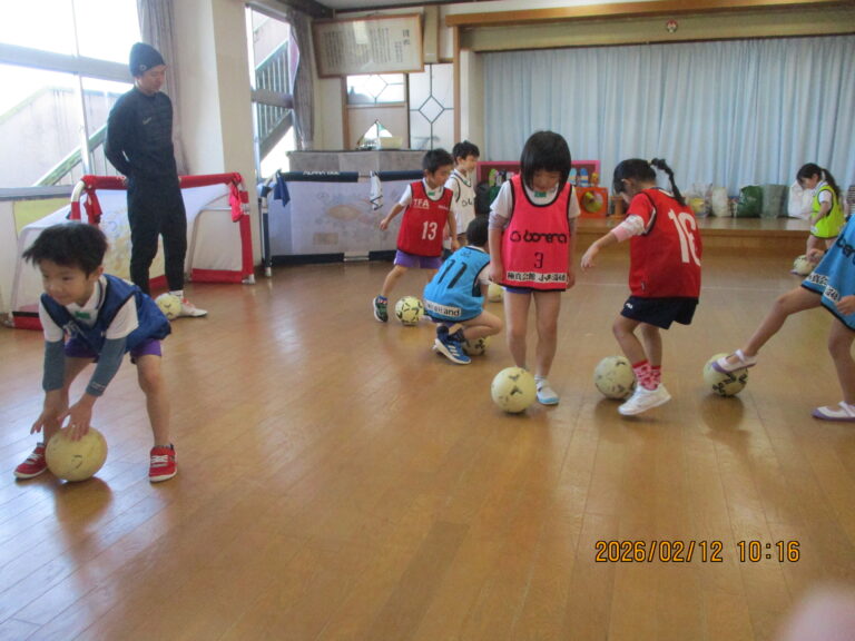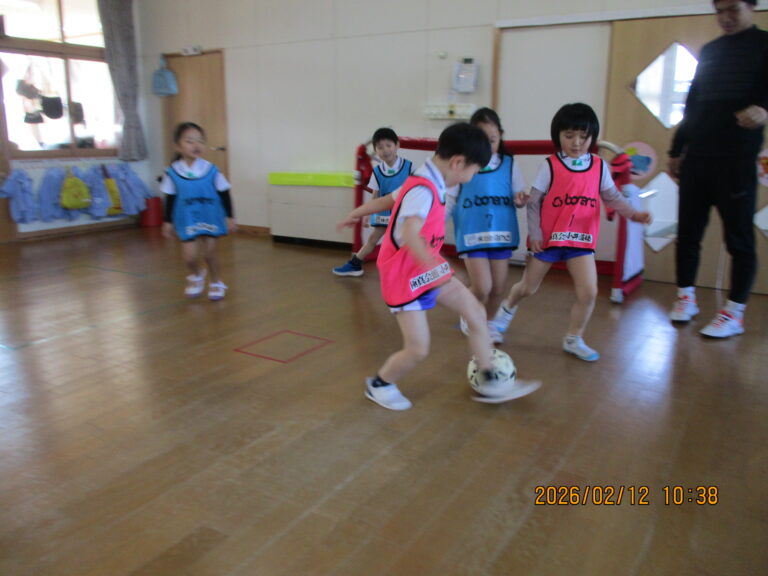 2026.02/12 サッカー教室(年長児) 今日は今年度最後のサッカー教室でした。最後のサッカーは今までの集大成として基礎練習~ミニゲームを行いました。 子ども達は、ミニゲームの中で今までの練習成果を存分に発揮していましたよ。