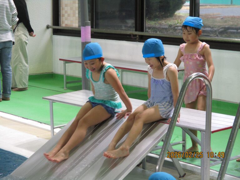 今日が最後の水泳教室でした。年長さん達は、今まで習ってきたことの総復習と、最後を満喫するかのようにいっぱい遊んできました。