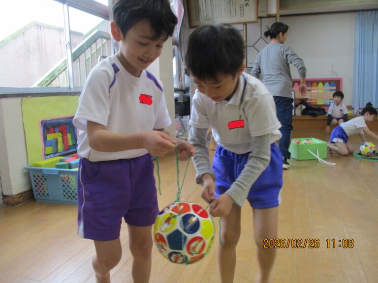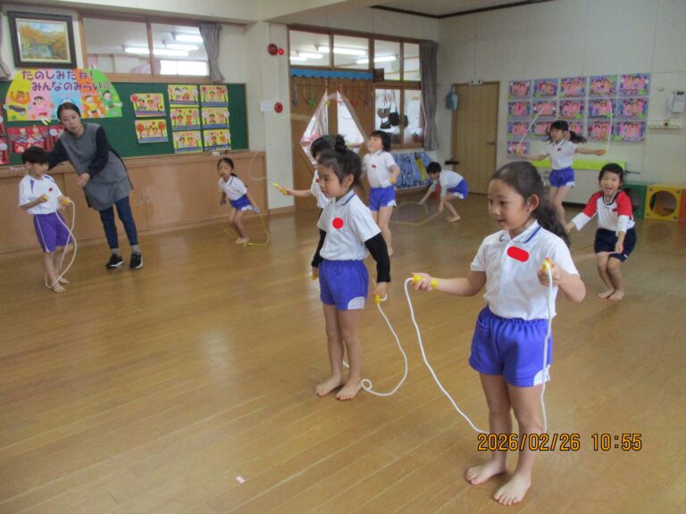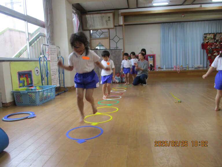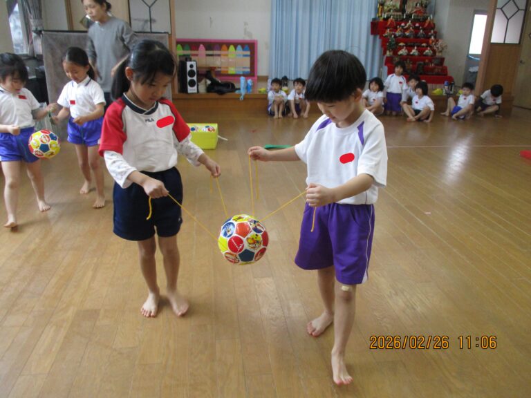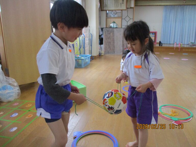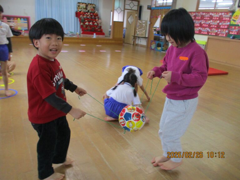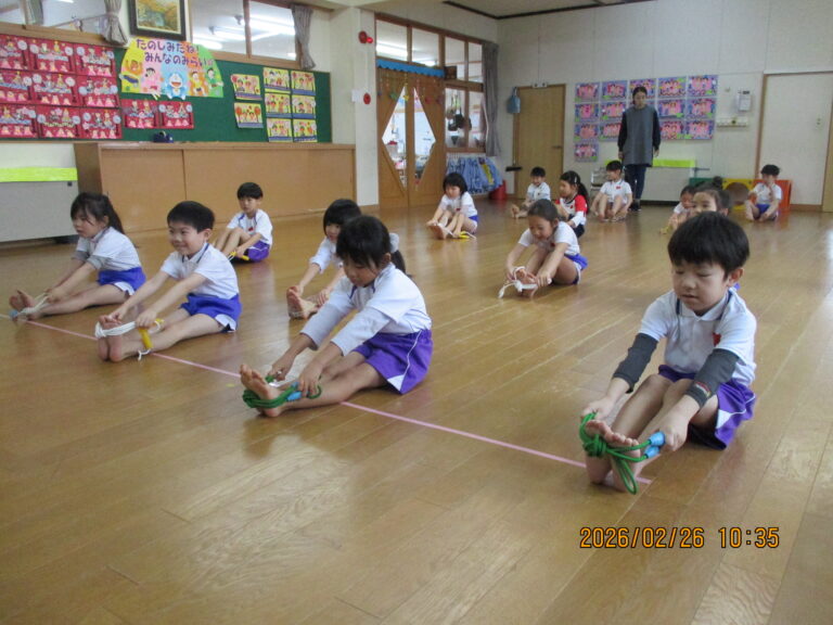 今日は令和7年度最後の体操教室でした。年中さんは、準備運動をした後、縄跳びをしました。縄跳びと言っても縄跳びができるようになる前の準備の動きから始めました。その後は、ゴムと毛糸を使ってのボール運びをしました。これはひもを引っ張る力の加減と相手との呼吸を合わせないとボールをうまく運べないので、かなり集中していましたよ。