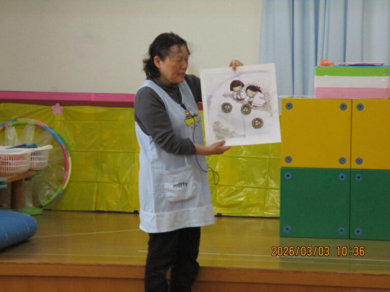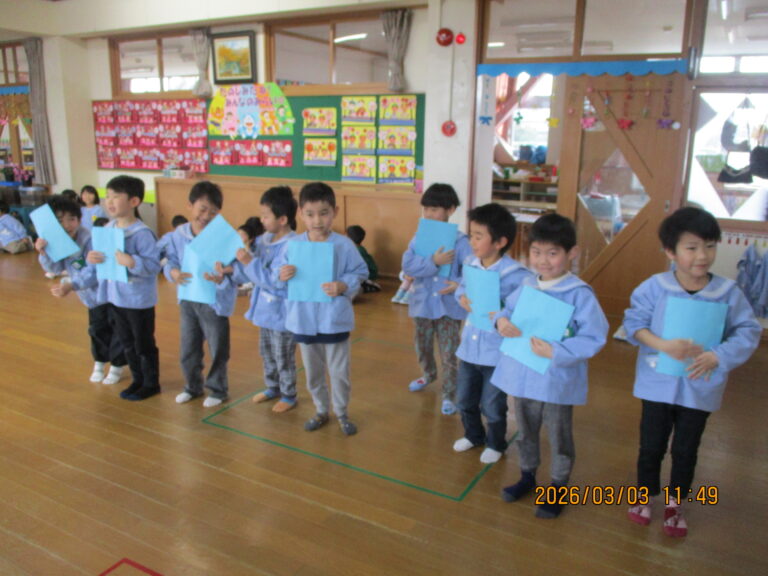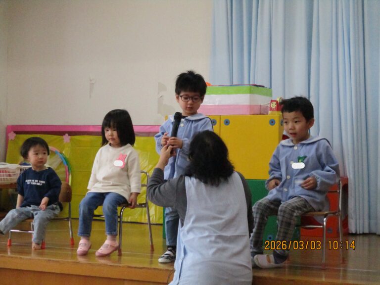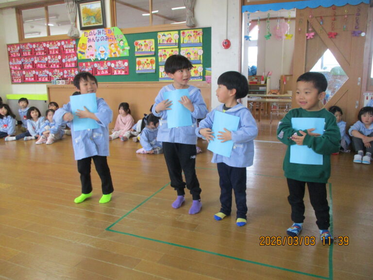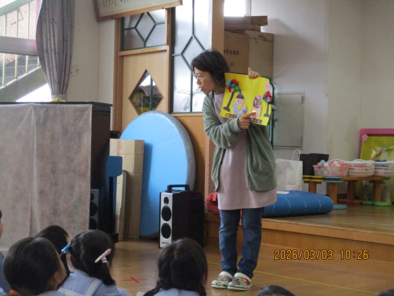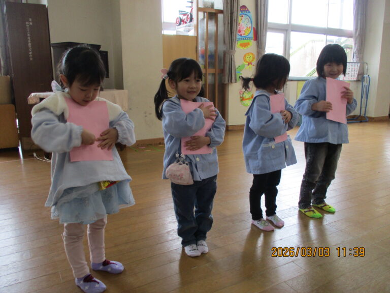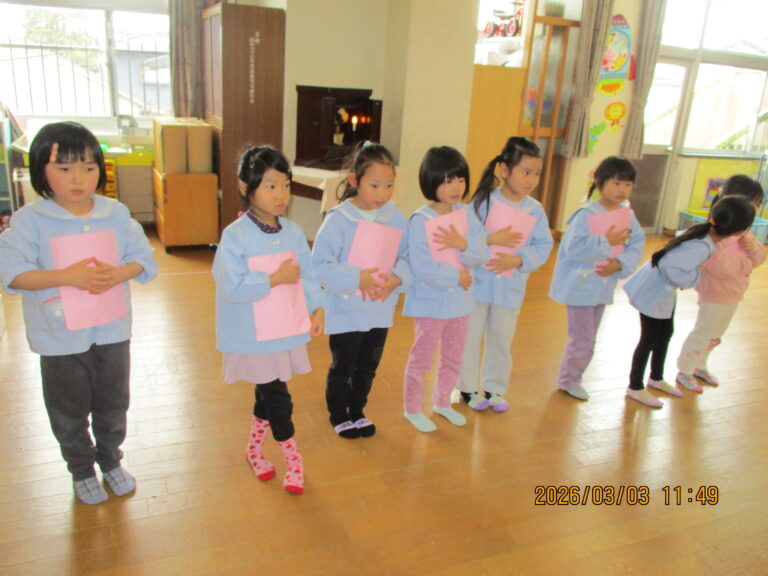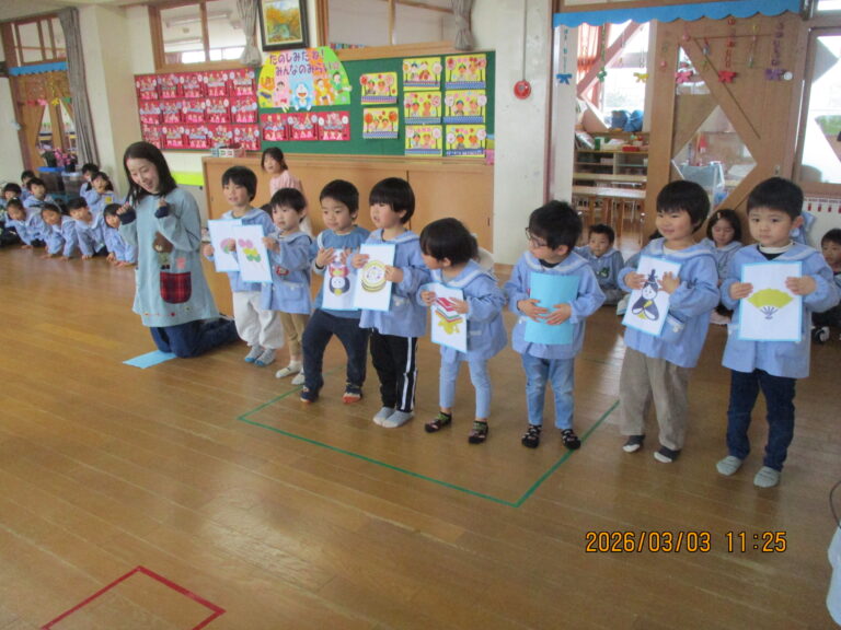 はじめにお誕生のお友達をお祝いして、その後にひなまつり会をしました。みんなの作品を紹介して、ひなまつりの由来の話を聞きました。