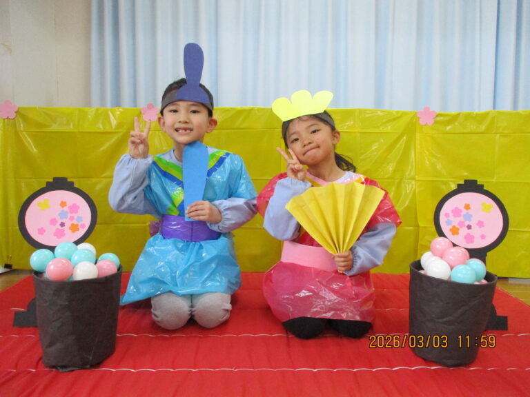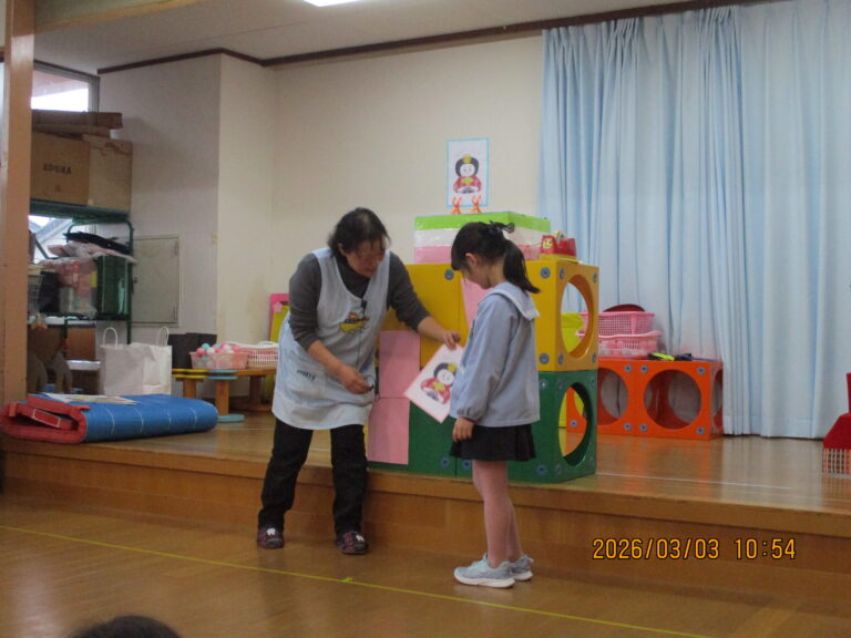 ステージには7段飾りのおひなさまが飾られていたので、おひなさまの紹介もしました。ゲームは神経衰弱をしたりボール運びをしたあと2人ペアで内裏雛になったりしましたよ。