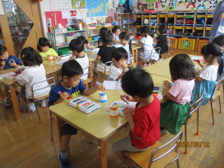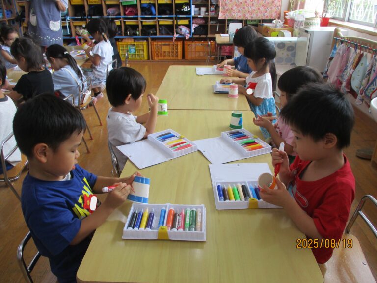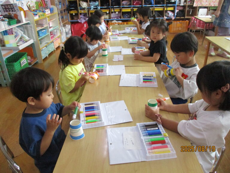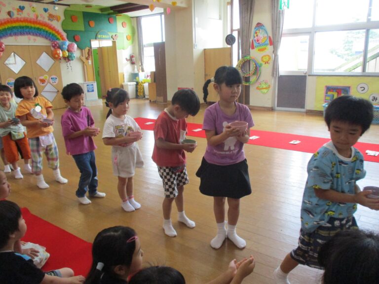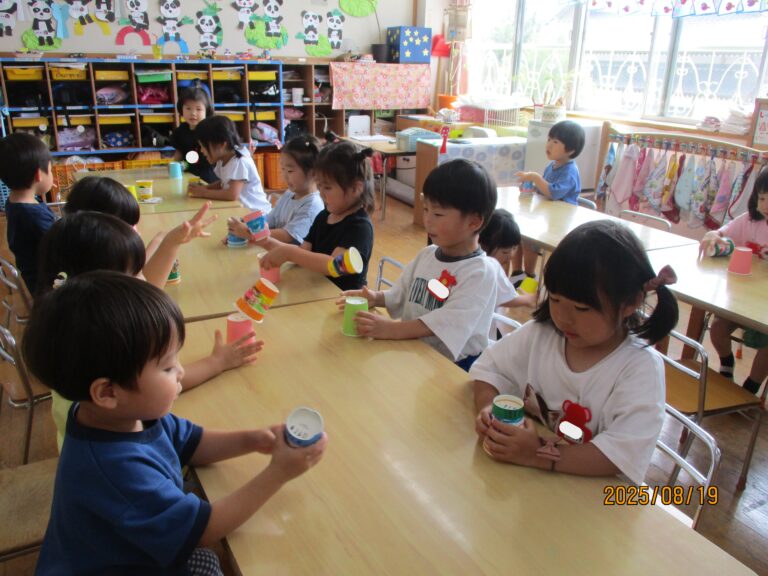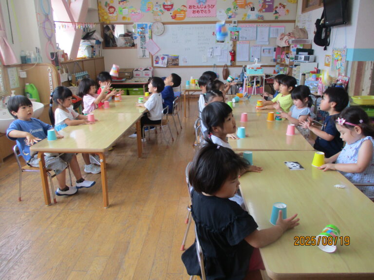 今日は、年長さんの茶道教室がありました。その間、年中さんは「洗濯遊び」と運動会で披露するバルーンの練習をしました。年少さんは紙コップでロケット作りをしましたが、それぞれオリジナリティあふれる作品になりました。ぴょ~ん!!と飛ばしてみましたよ。