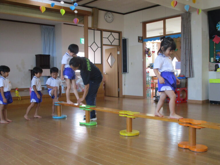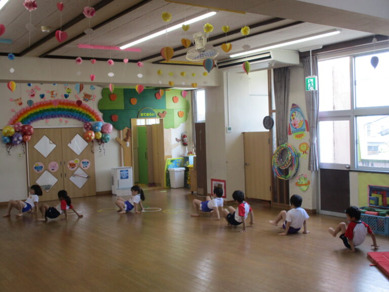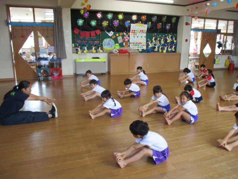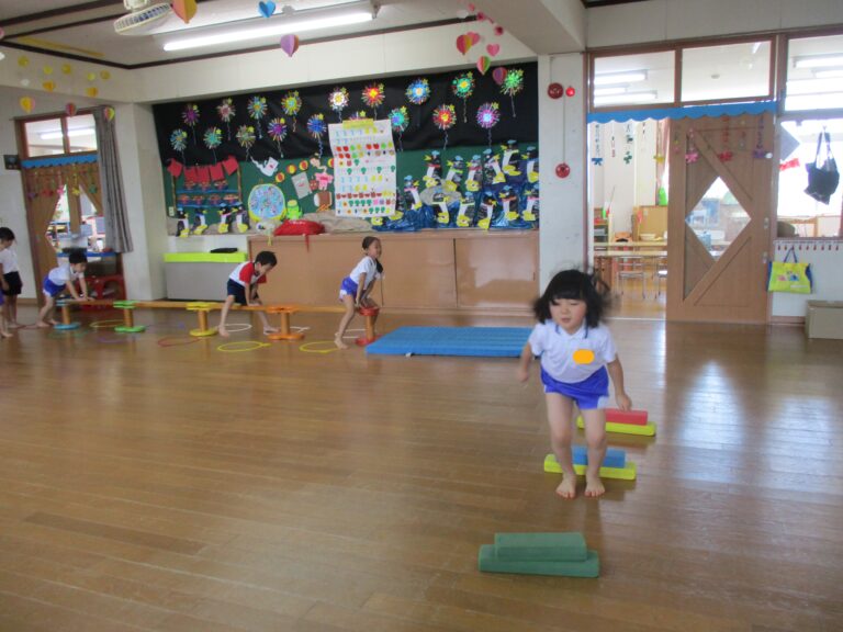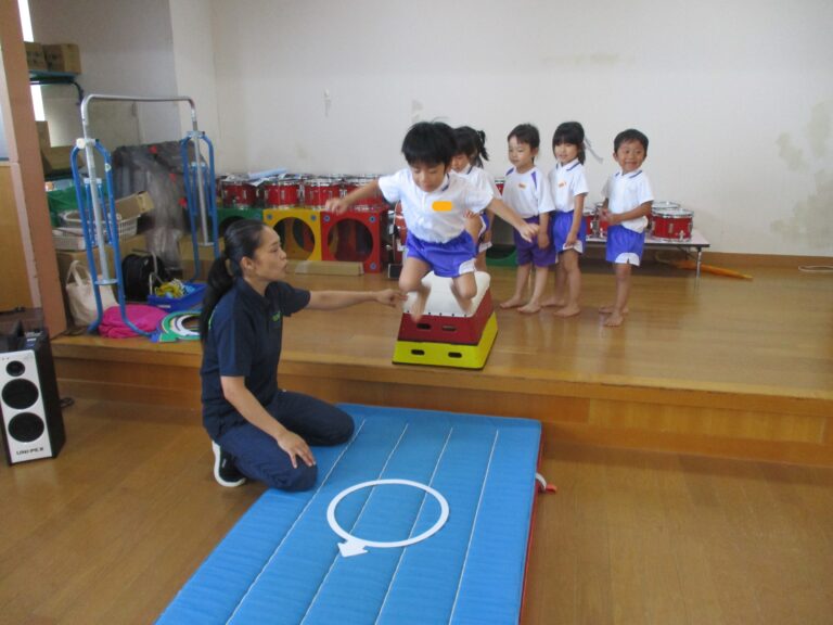2025.08/21 8月の体操教室(年長・年中児) 今日は体操教室でした。年長さんも年中さんもストレッチなどの準備運動はお手のもの。今日はどちらも「跳び箱」の運動でした。年長さんは跳び箱を跳ぶための体の使い方、年中さんは跳び箱から飛び降りることで「飛んだ後の着地の仕方」を学びました。