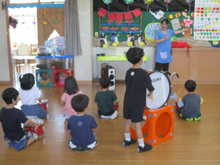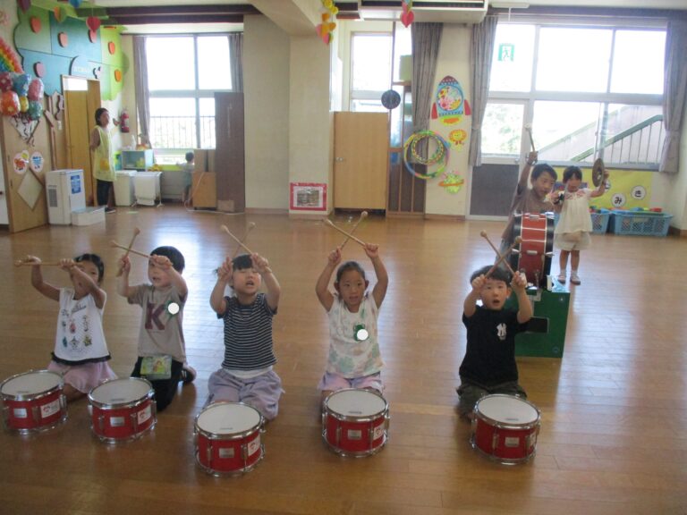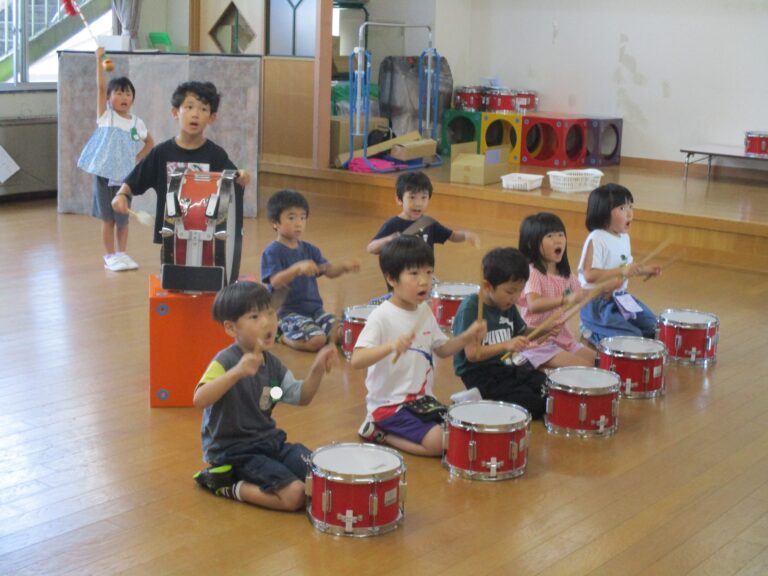 今日は、年長さんが運動会の鼓隊の練習をしているのをパチリ!絵譜を見ながらではありますが、曲に合わせてリズム打ちができるようになりました。