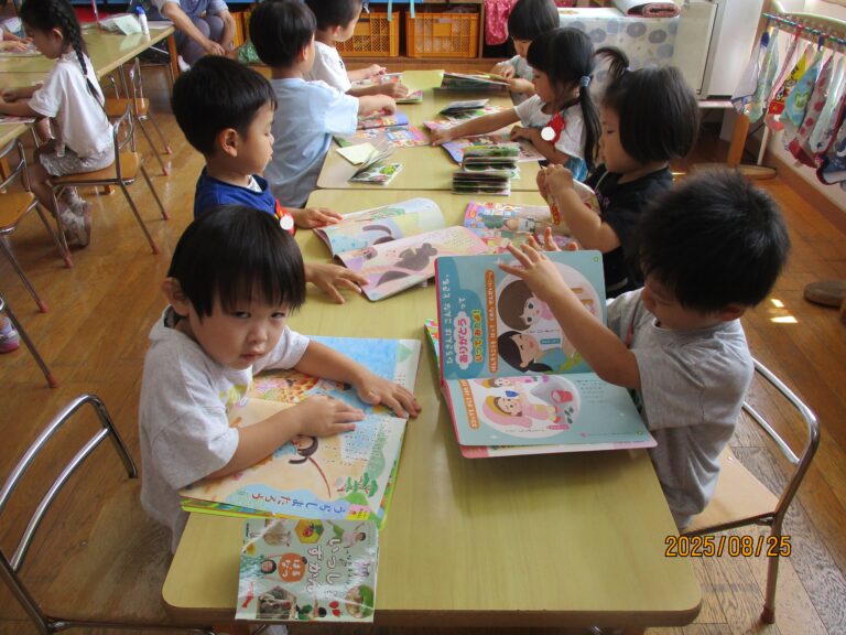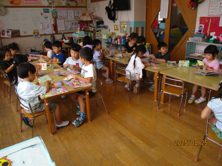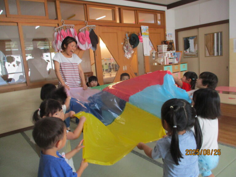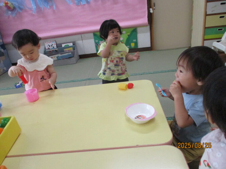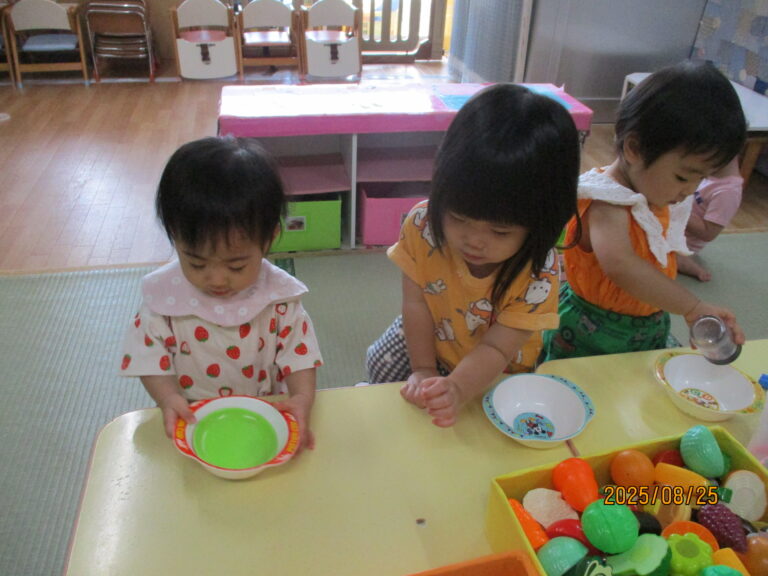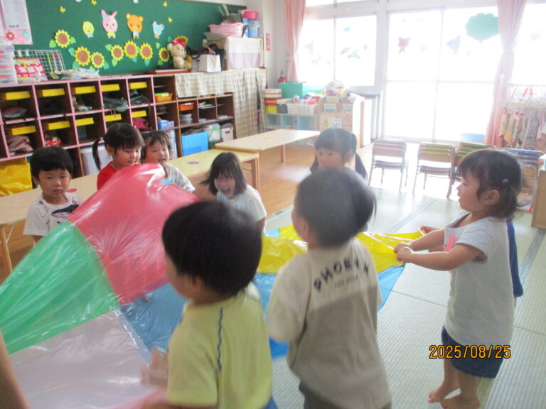 年少さんは月刊絵本「いっしょ」を読んでシールを貼りました。うさぎぐみさんは、カラーポリ袋をつなぎ合わせて、年中さんが練習しているバルーンのようにして動かしてみましたよ。ひよこぐみさんはおままごとをしました。