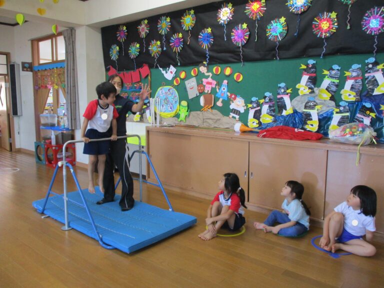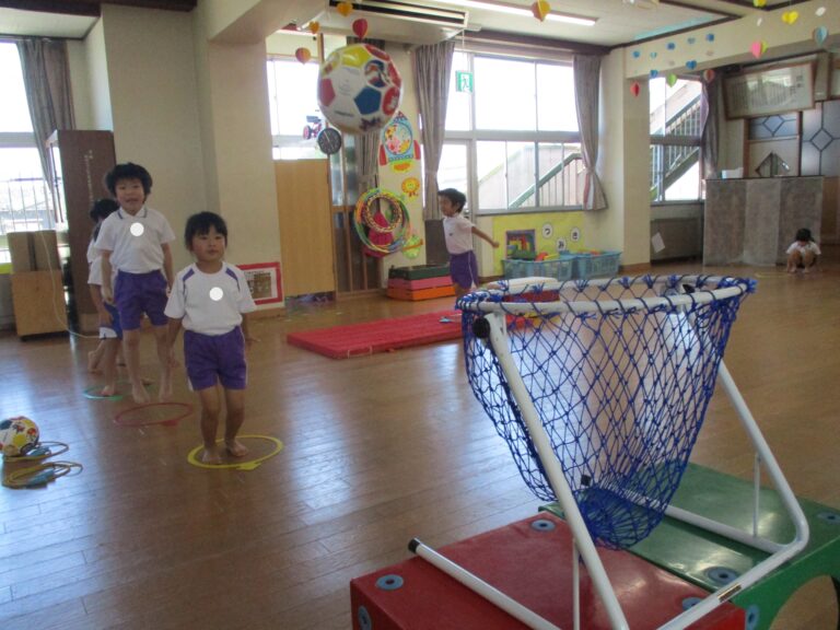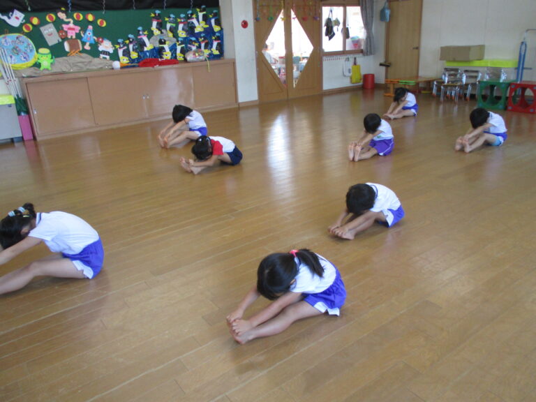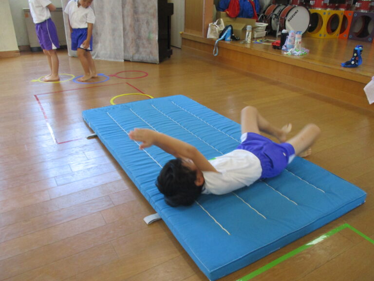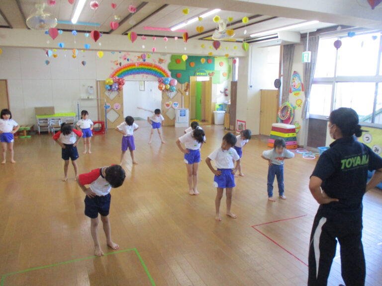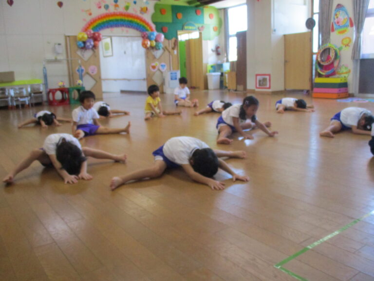 今日の体操教室は、いつもとは趣向を変えて、前半を「くまぐみ(年中・年長児)」、後半を「ぞうぐみ(年中・年長児)」に分けて行いました。普段は年齢別で行っていますが、今回は年長さんが見本となり、年中さんが年長さんを見習って後についていくという相乗効果も見られ、新鮮に感じました。