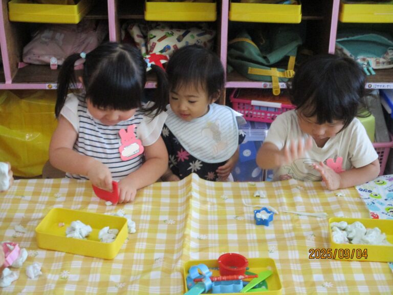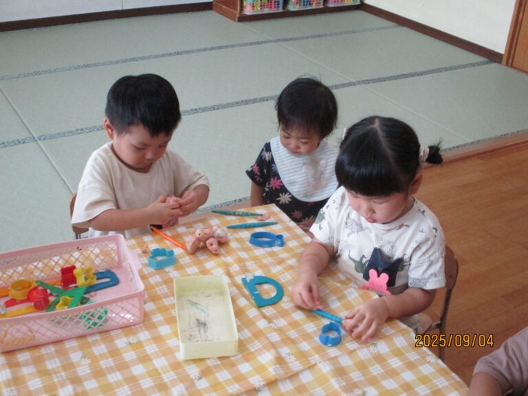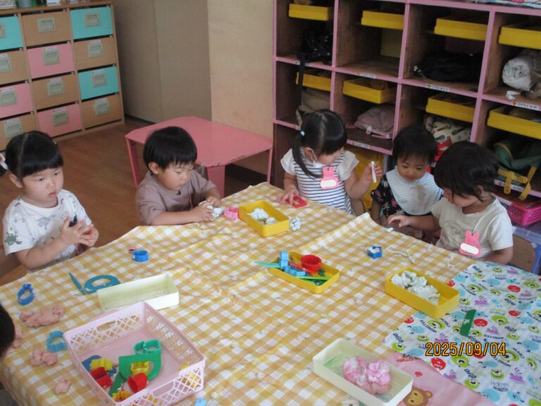 うさぎぐみさんは粘土をしました。途中からひよこ組さんが興味津々で見に来たので、「こうやるんだよ」「これ、見て」など、使い方を知らせたり自分の作品を見せたりして、こちらでもお兄ちゃん・お姉ちゃんぶりを発揮していました。