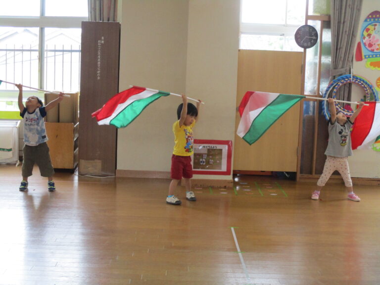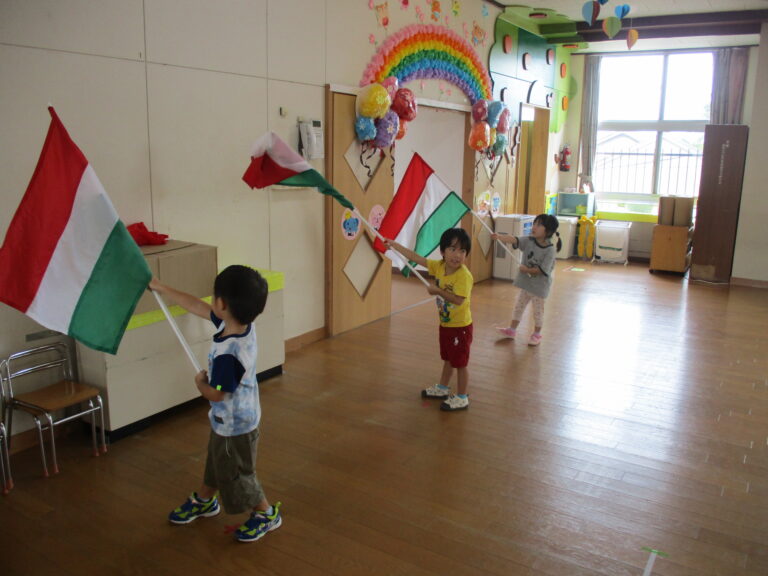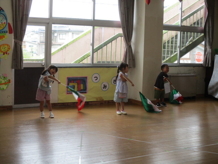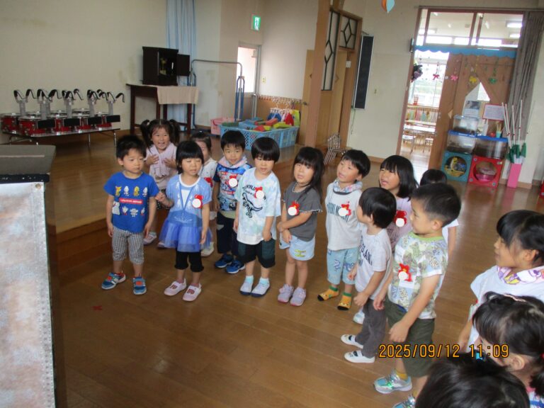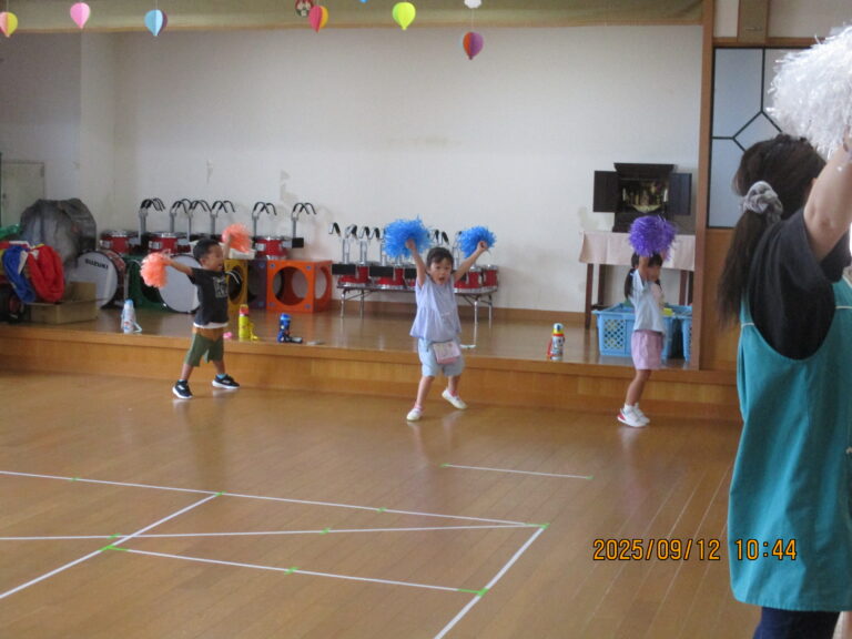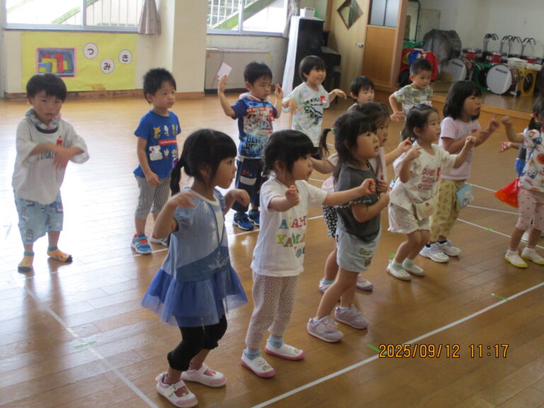 今日は、年少さんは「うんどう会の歌」を歌ったり、踊りの練習をしたりしました。その後園庭に出てかけっこもしましたよ。