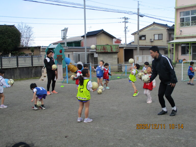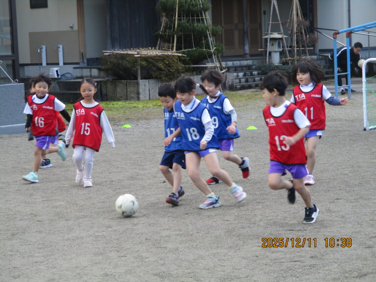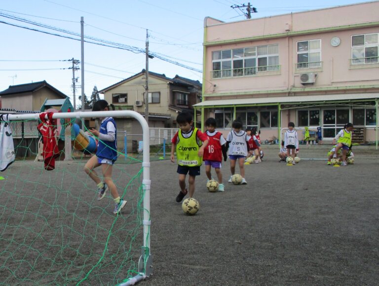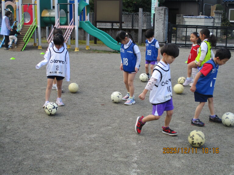 今日のサッカー教室は園庭で行いました。でも、始まる時はおひさまが雲に隠れていたので体感温度は極寒!それでも子ども達はとっても元気で、練習中も賑やかでしたよ。ボールをパスしたり、ドリブルでゴールめがけて走ったり、ディフェンスをしたりする姿はみんなとってもかっこよかったです。