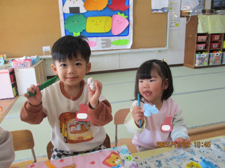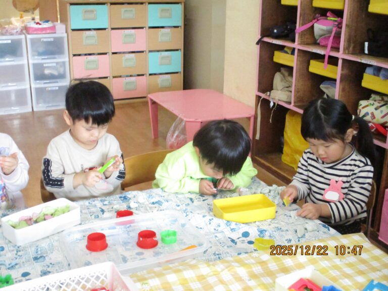 うさぎぐみさんは粘土遊びをしました。粘土は指先の力加減やイメージしたものを立体的に作り出すことなど、子どもの発達にはとても良い教材です。みんなそれぞれ作りたいものをイメージして夢中で作っていましたよ。