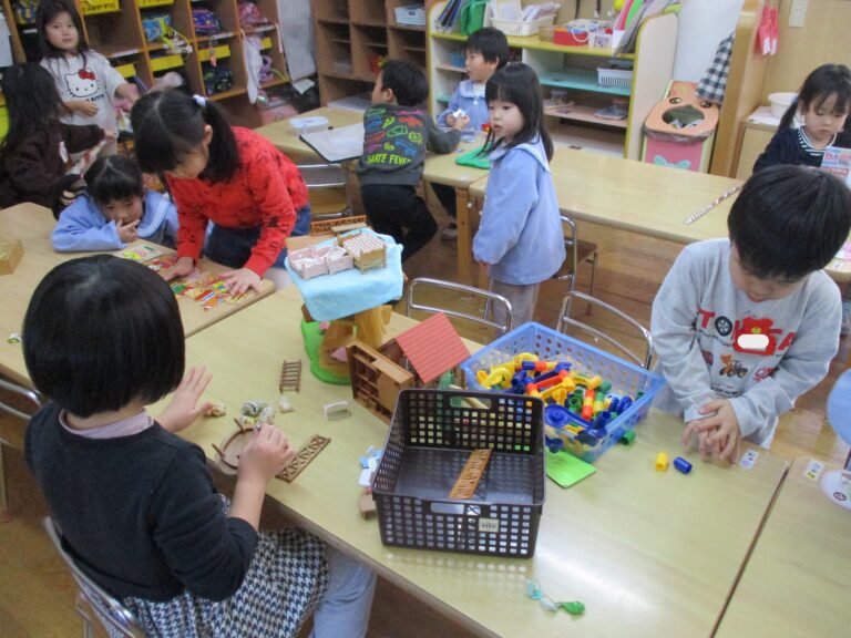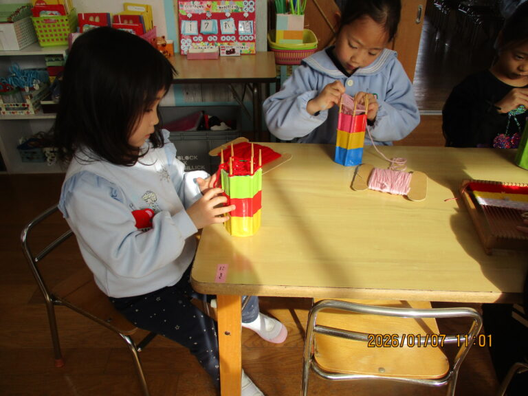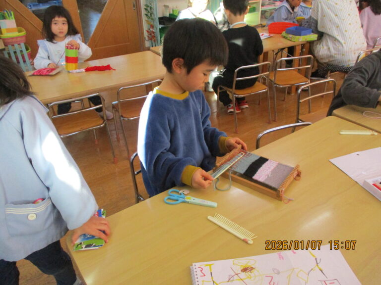 今日は、各部屋で思い思いにお正月遊びやままごと・機織り・マフラー編み・ブロックetc・・・をして遊びました。