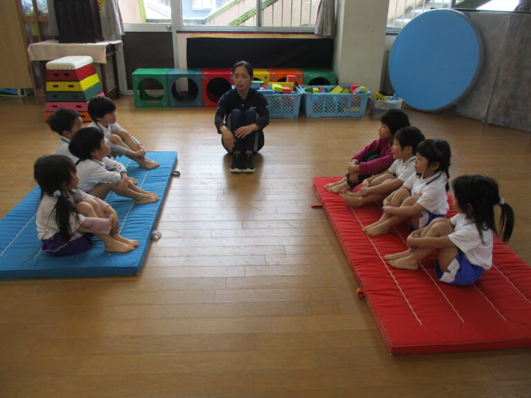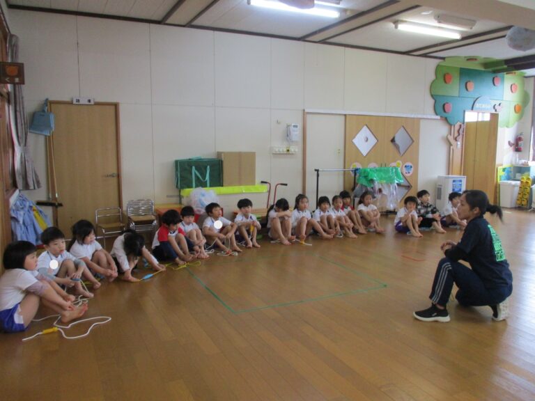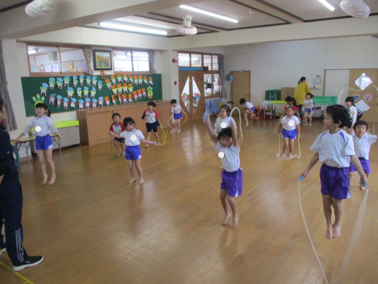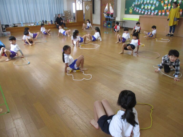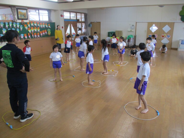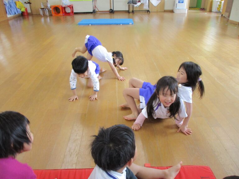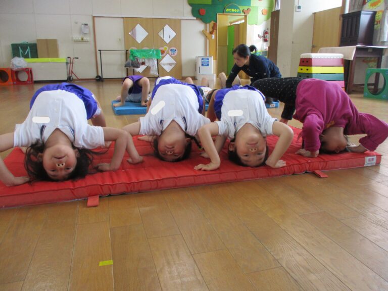 今日は体操教室でした。まずは年長さんからで、ブリッジをしたり縄跳びの縄や鉄棒を使って体を動かしました。