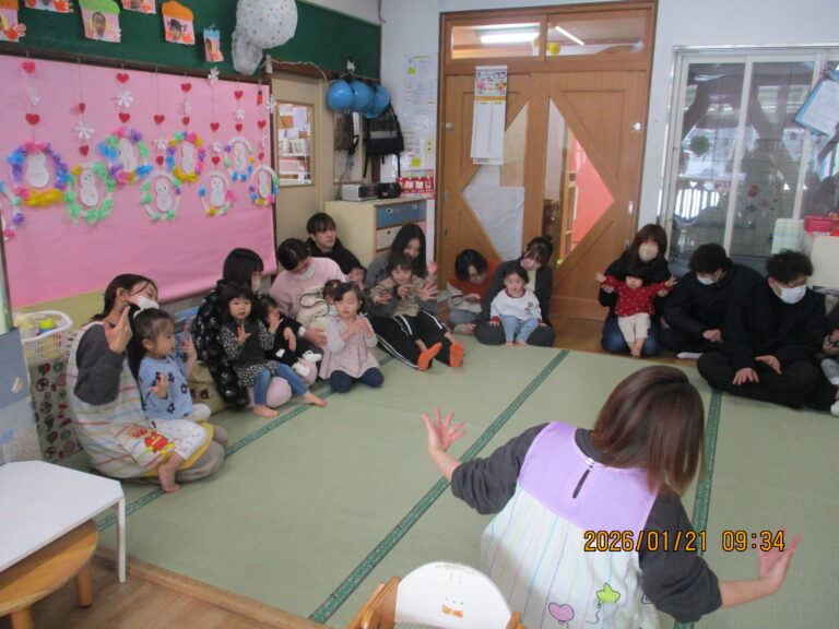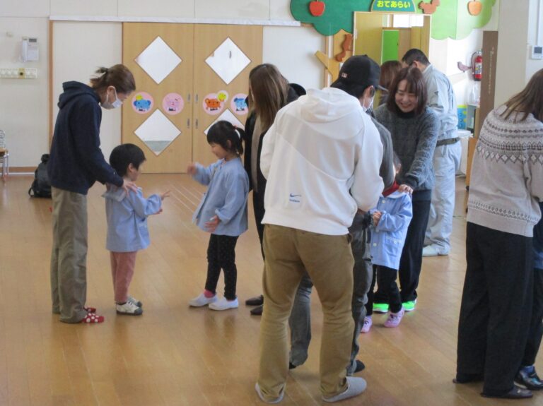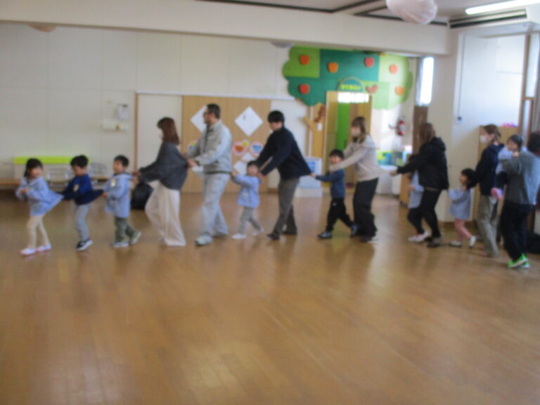 今日は保育参観の2日目で、年中さんとひよこぐみさんでした。年中さんは遊戯室で手遊びやゲームをしました。はじめにジャンケン電車をしました。曲に合わせて親子でジャンケンをしてから、どんどん他の親子と対戦していき、最後には1本の長い電車になりました。