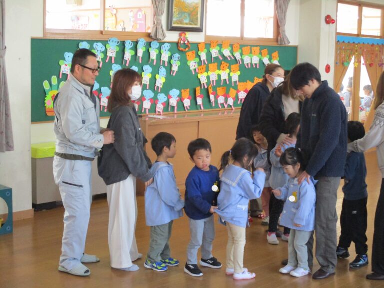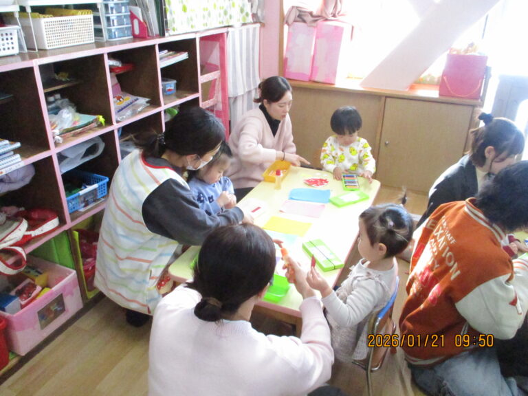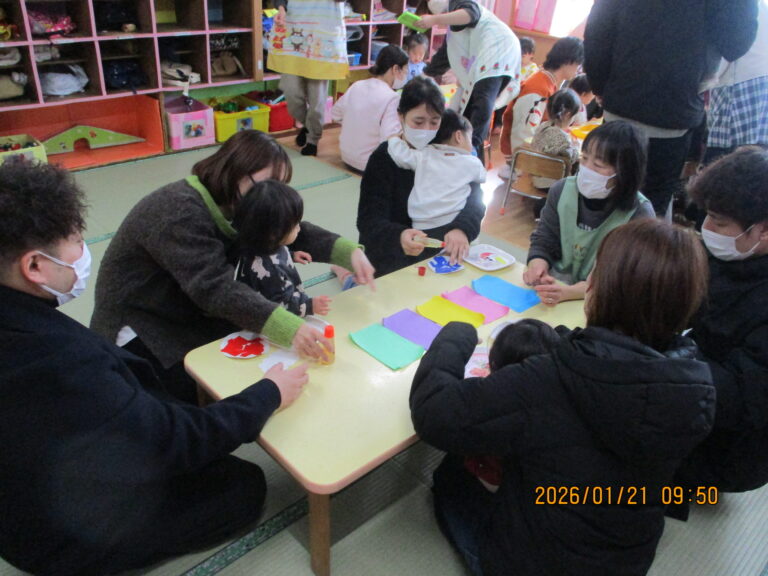 ひよこぐみの参観は、おやつを食べているところからスタート。食べ終わるとパパやママのお膝に座って朝の集まりをしました。そして、保護者の方と一緒に鬼のお面を作りましたよ。最後にみんなでお面をかぶってみました。とってもかわいい鬼さんが完成しましたよ。