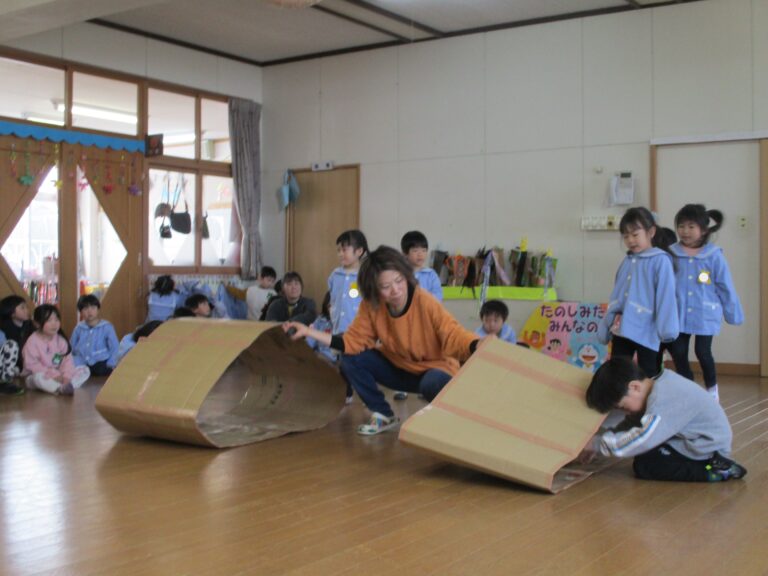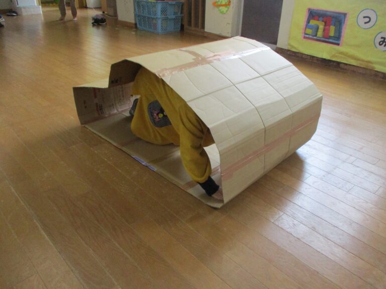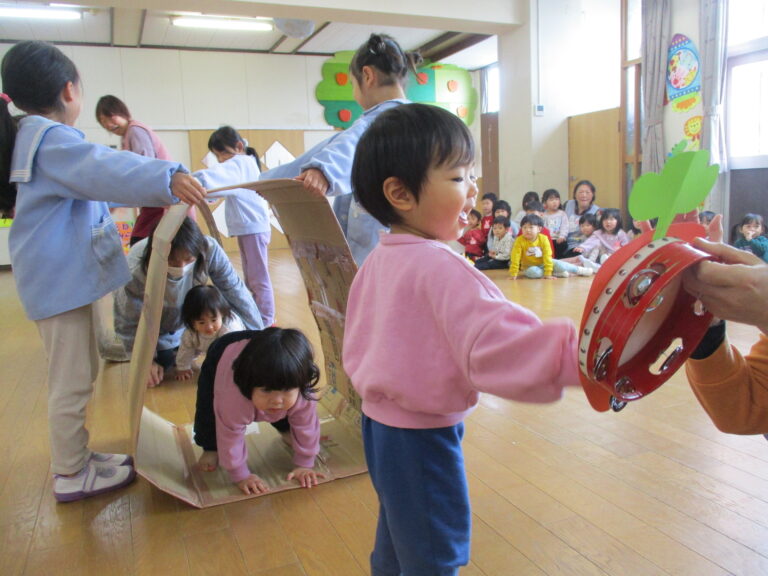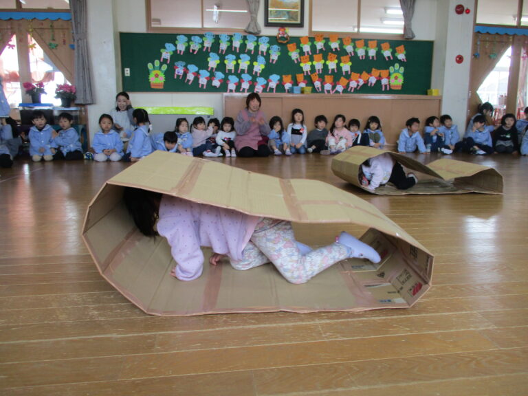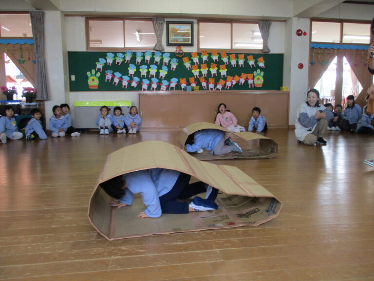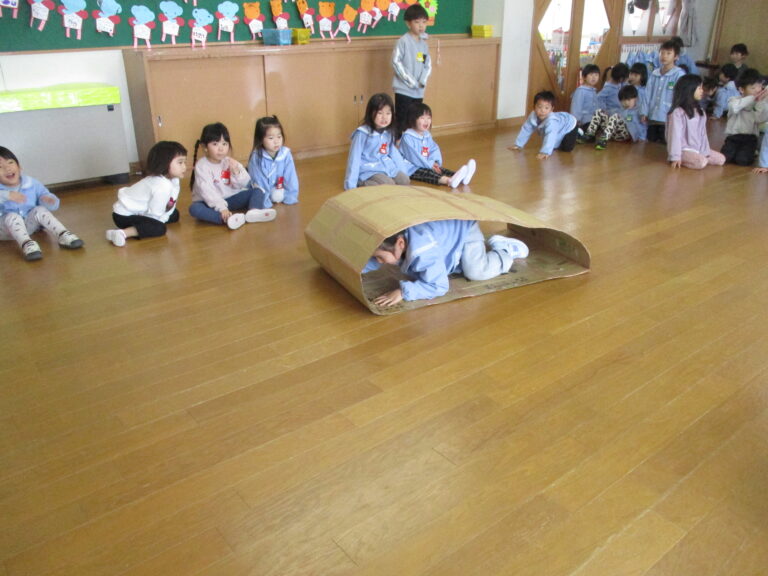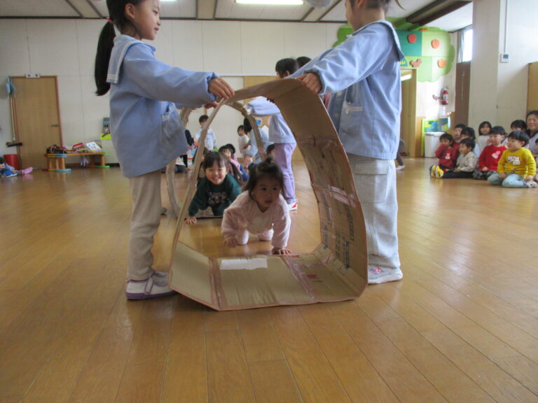そして次はゲーム!今回は段ボール製のキャタピラーを使ってのクラス対抗ゲームでした。ひよこぐみさんはキャタピラーをトンネルにしてくぐっていきました。うさぎぐみさんからはキャタピラーにして進んでいったのですが、はじめに先生が見本としてやってみると、子ども達はすぐにキャタピラーでの進み方がわかったようで、ちゃんと前進していましたよ。