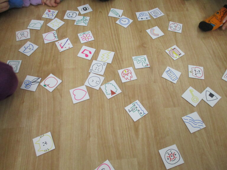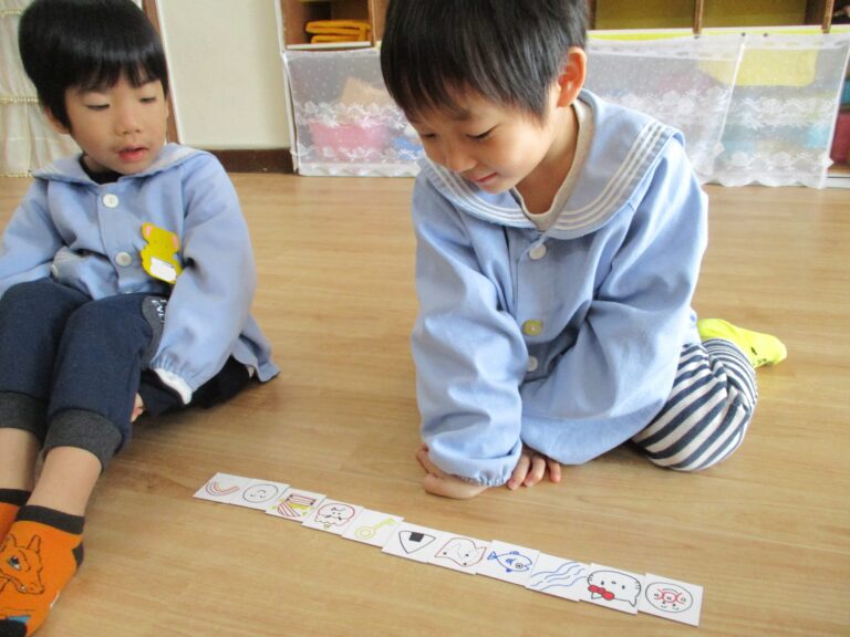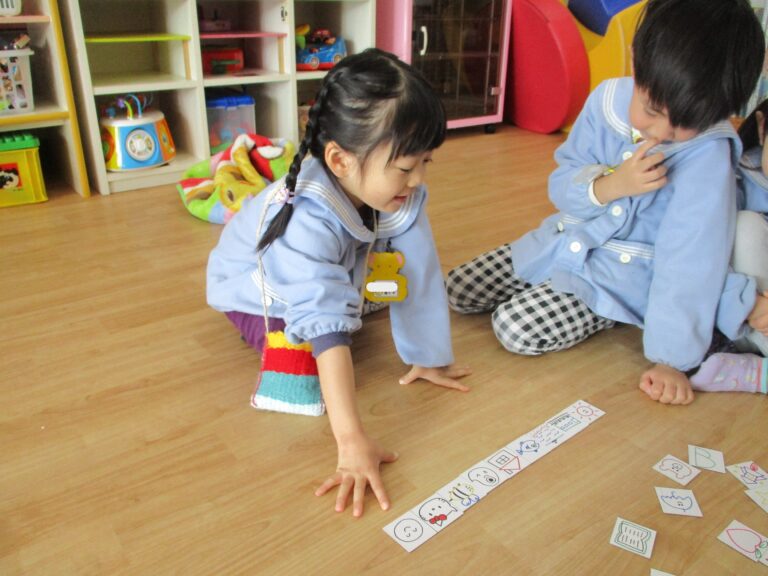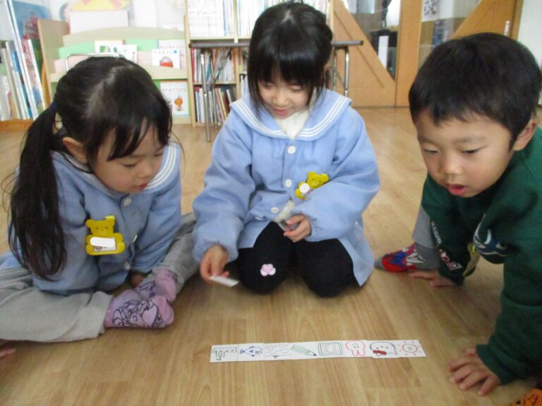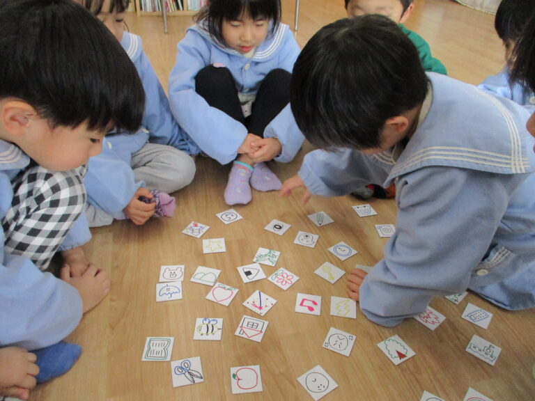 年中さんは「ストーリーカード」をしました。「ストーリーカード」は、たくさんの絵カードの中から選んでいき、つながった絵を見てストーリーにしていくという想像力を働かせる遊びです。子ども達は絵を見てストーリー(物語)になるようにしっかりと頭をフル回転させて考えていましたよ。大人では思いつかないストーリーになることもあり、子どもの想像力に驚かされます。