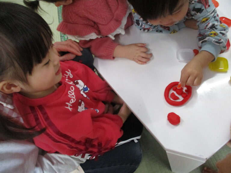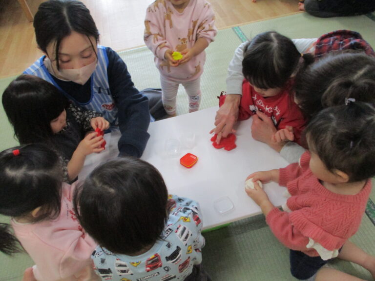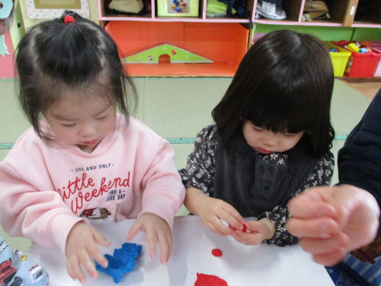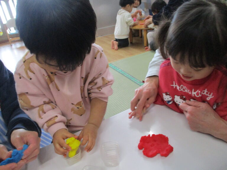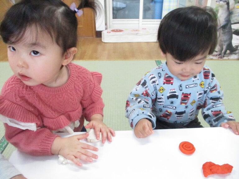 ひよこぐみさんは小麦粉粘土で遊びました。いつもの粘土とは違う色合いがまた魅力的で楽しんでいましたよ。