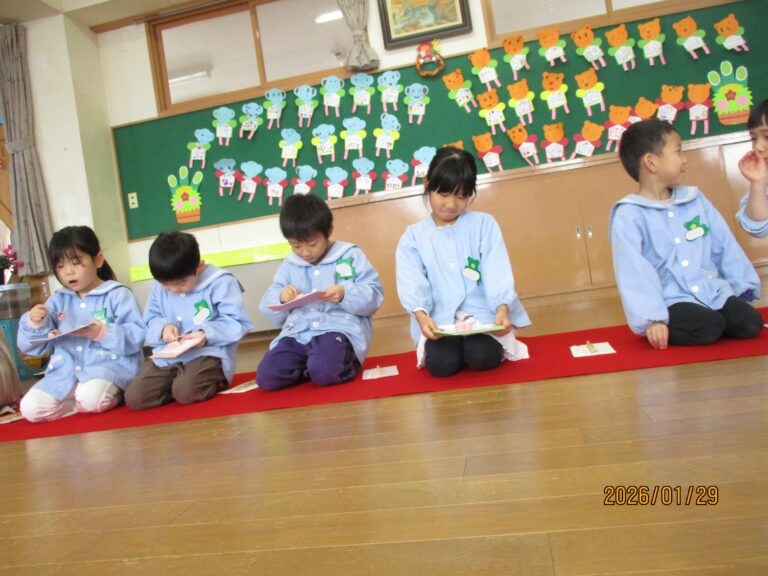 今日は、年長さんの茶道教室がありました。今日初めて練り切りのお菓子をいただきました。くろもじ(楊枝)を使って切りながら食べることが初めての子ども達は、はじめは戸惑いながらも食べていくうちにできるようになりました。3月のお茶会まで教室はあと1回です。保護者の皆さんをお招きしてのお茶会にいまからドキドキしています。