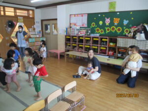 まずは、うさぎぐみで運動会の踊りの練習をしているひよこ・うさぎぐみさんの様子を見守られたあと、ひよこぐみのおもちゃで遊びました。