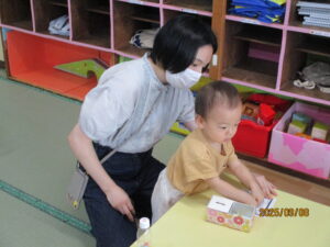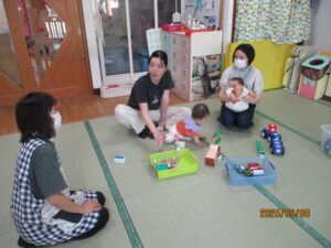 今日は「保育園で遊ぼう」という園内のどこのお部屋へ行ってもよい日でした。2組の親子さんが参加され、うさぎぐみとひよこぐみで遊ばれました。