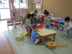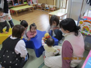 2組のお友達が参加されました。来られてすぐに、ひよこぐみの保育士から「一緒にひよこぐみで遊ぼう!」とのお誘いがあり、少しおジャマすることにしました。
