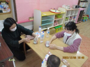 しばらく遊んだ後、なかよしルームに戻り、スノードーム作りをしました。スノードームはとっても簡単であっという間に完成!!でも、それぞれが「世界に1つだけのスノードーム」となりました。ぜひ、おうちに飾ってくださいね。